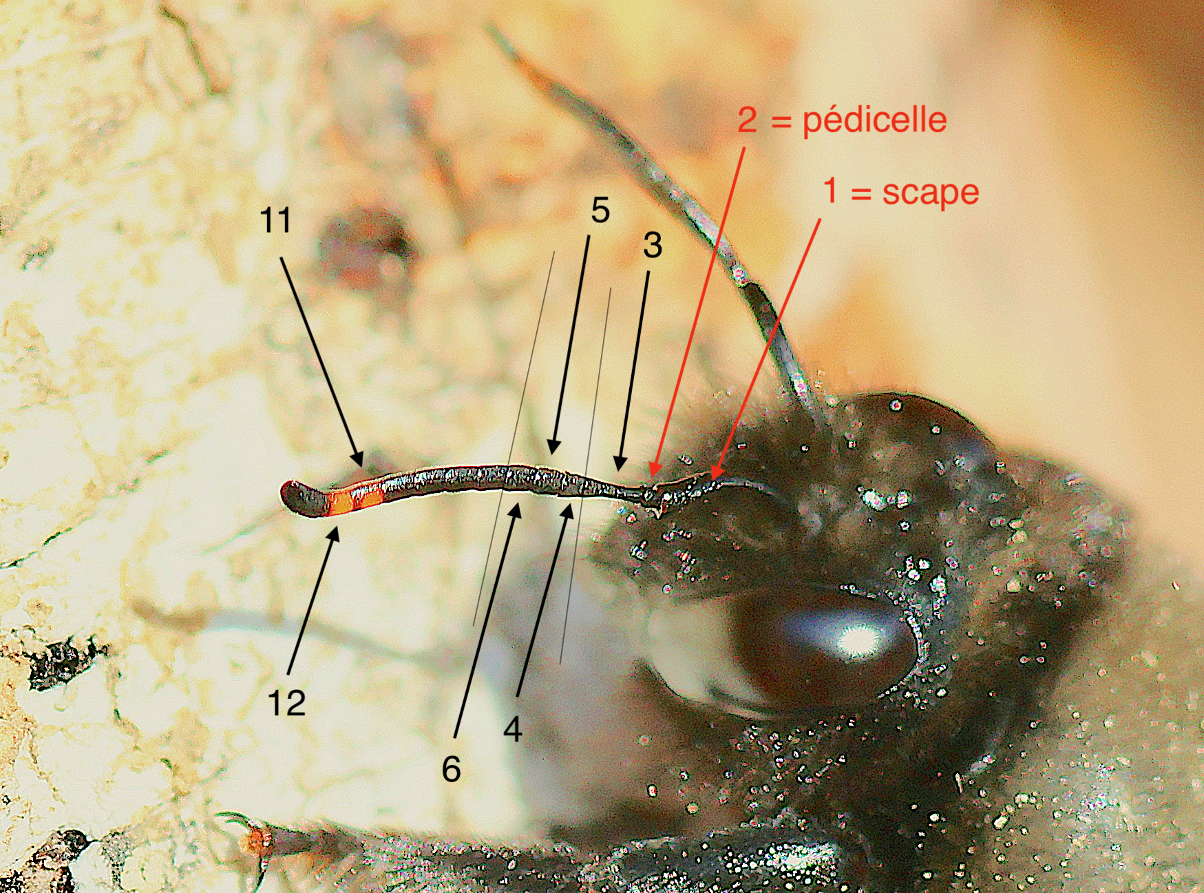 Gros plan sur les antennes d’un mâle de xylocope violacée, montrant les é articles subterminaux orangés et l’égalité de la taille du 3° article antennaire d’avec les 4+5+6°